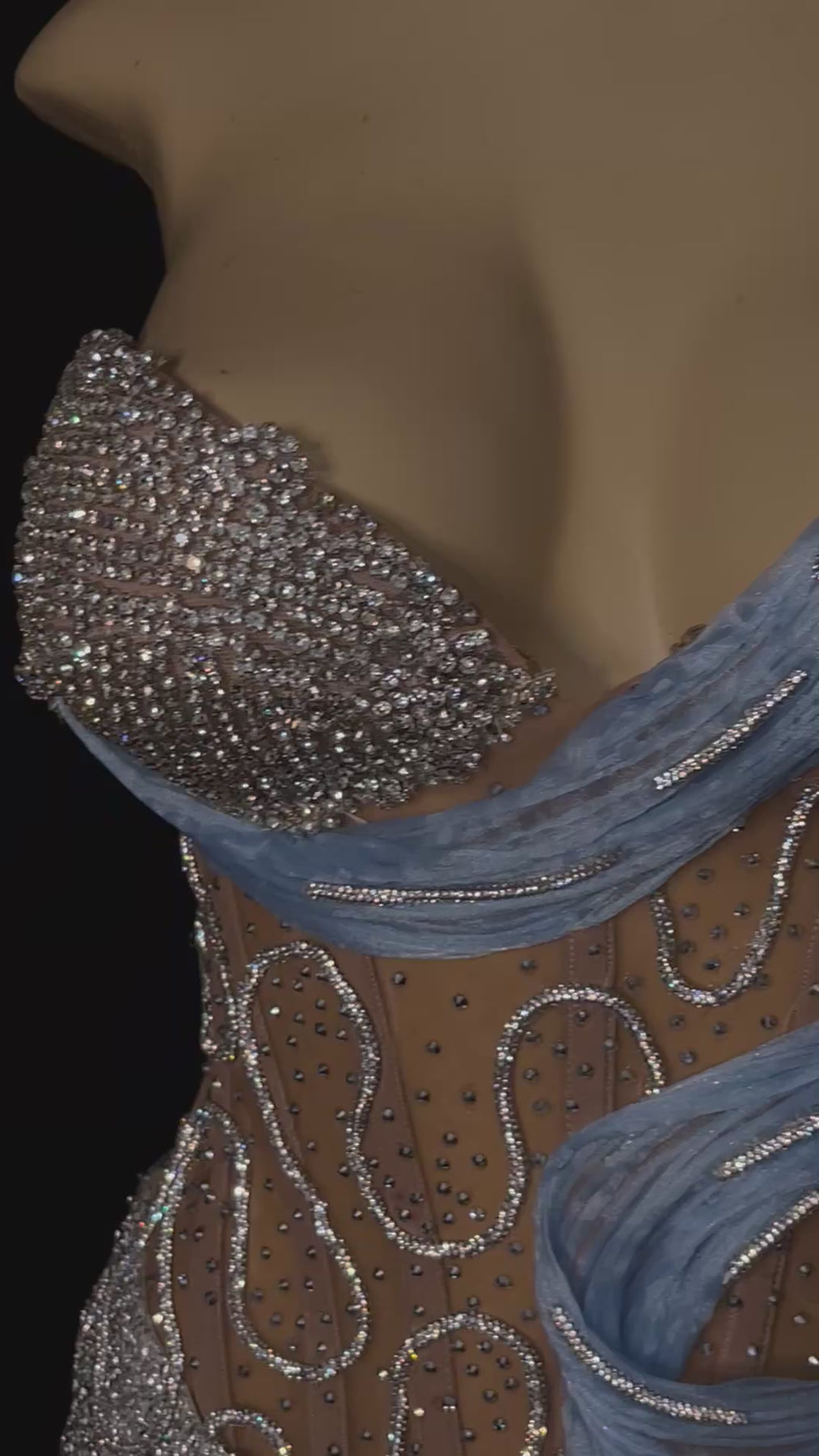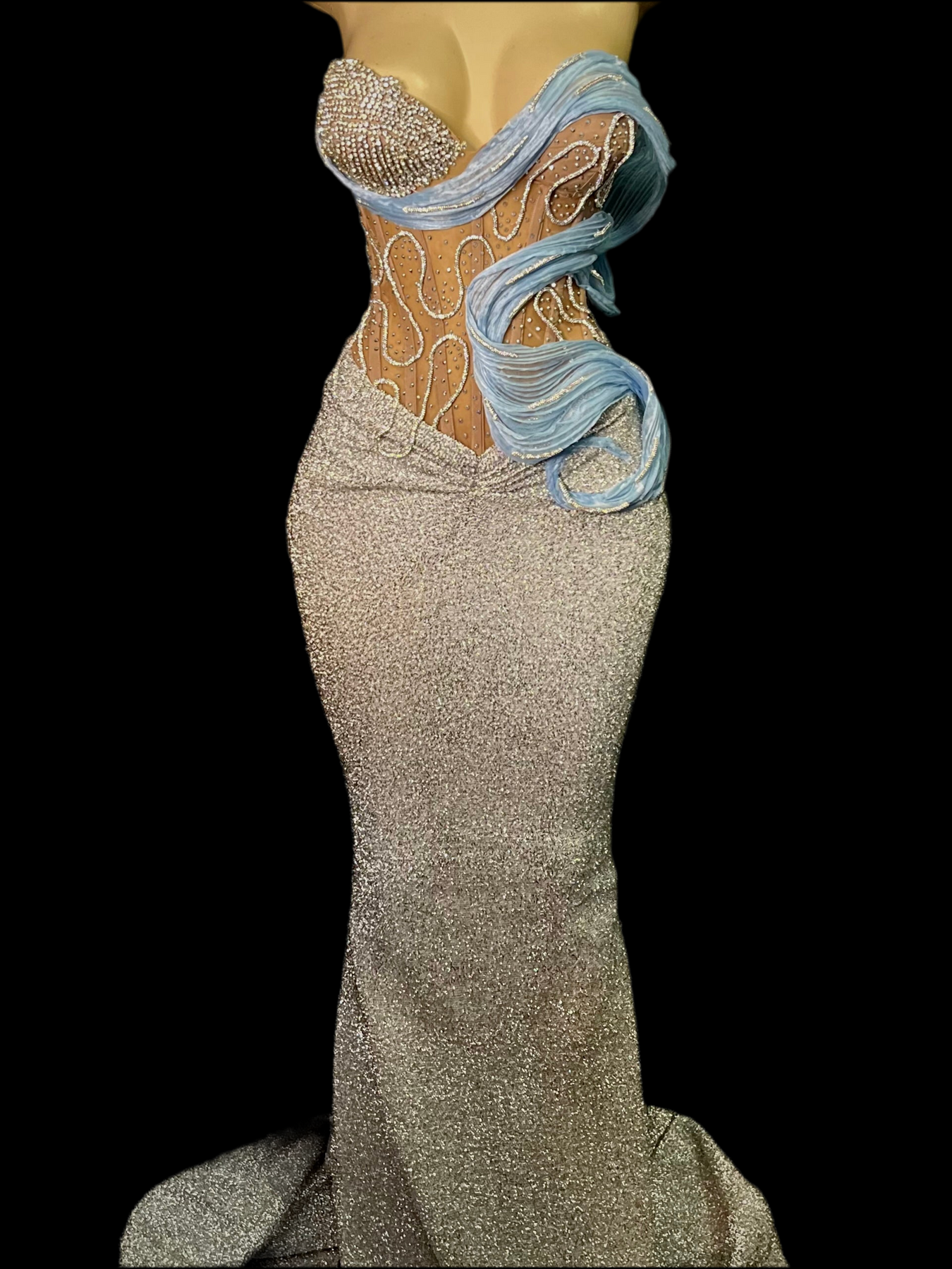 Take a bold and daring step in our Jadis silver corset gown, featuring a 3d powder blue spiral attachment encrusted in rhinestones. With a fitted stretch skirt, this dress will bring out the risk taker in you!