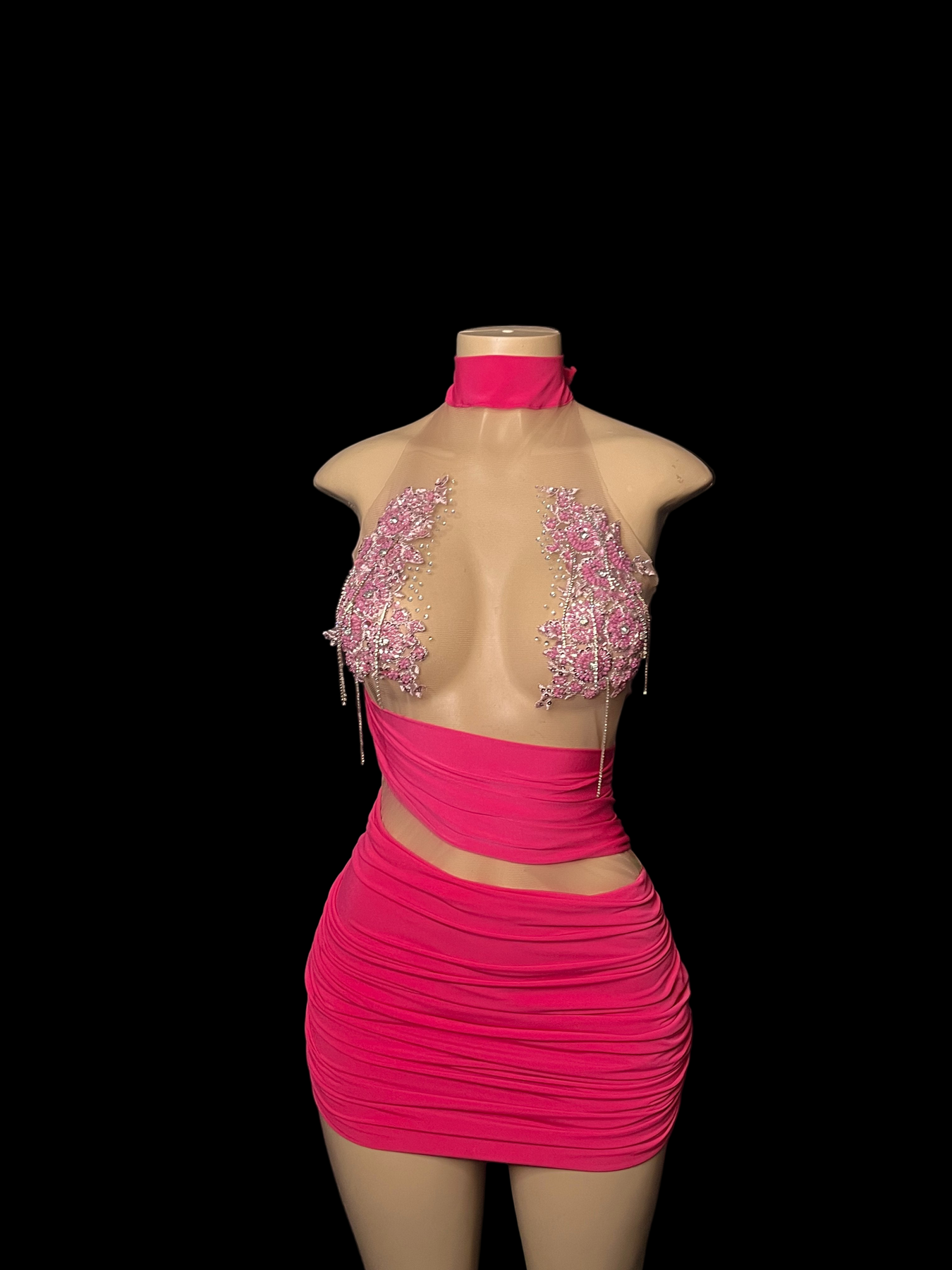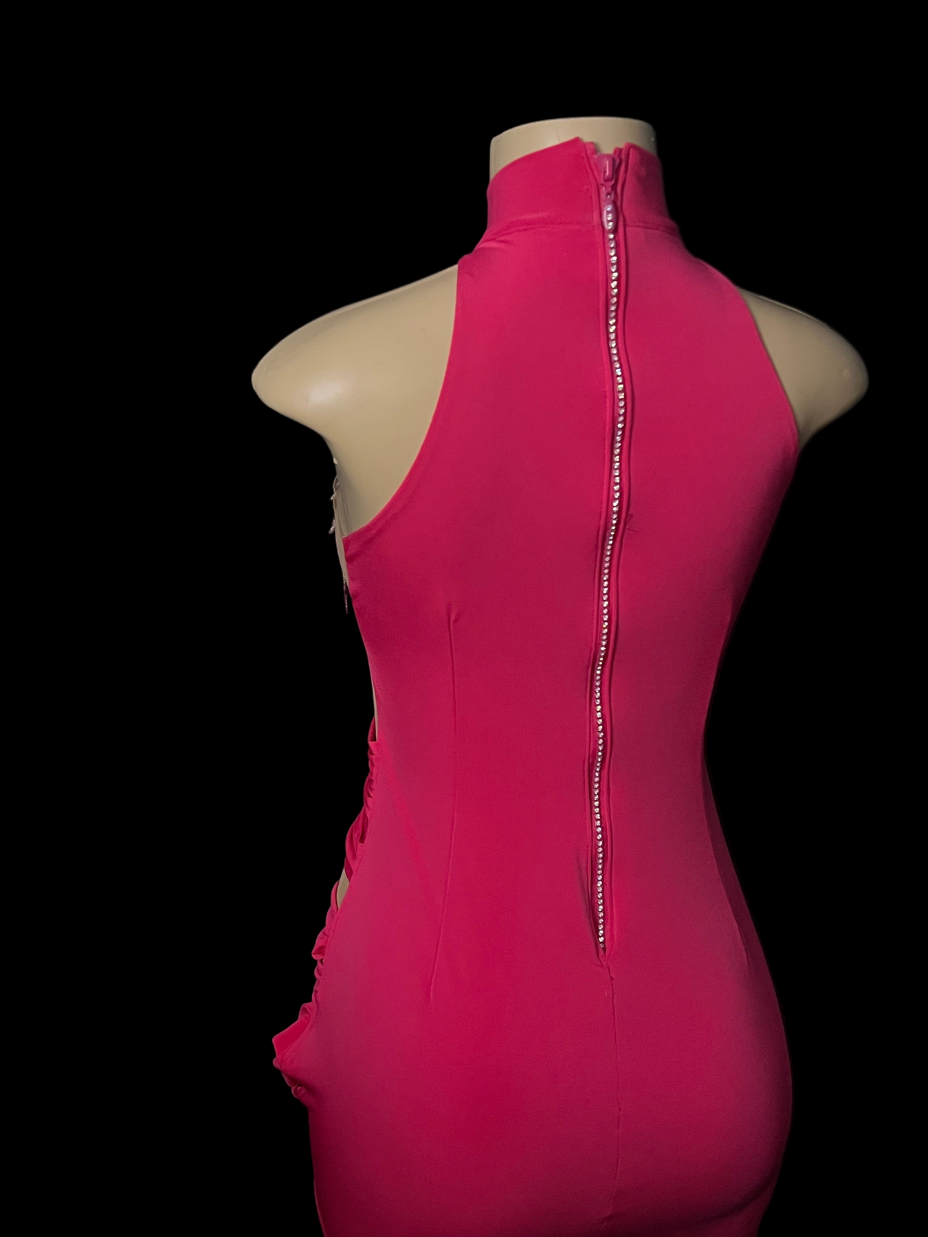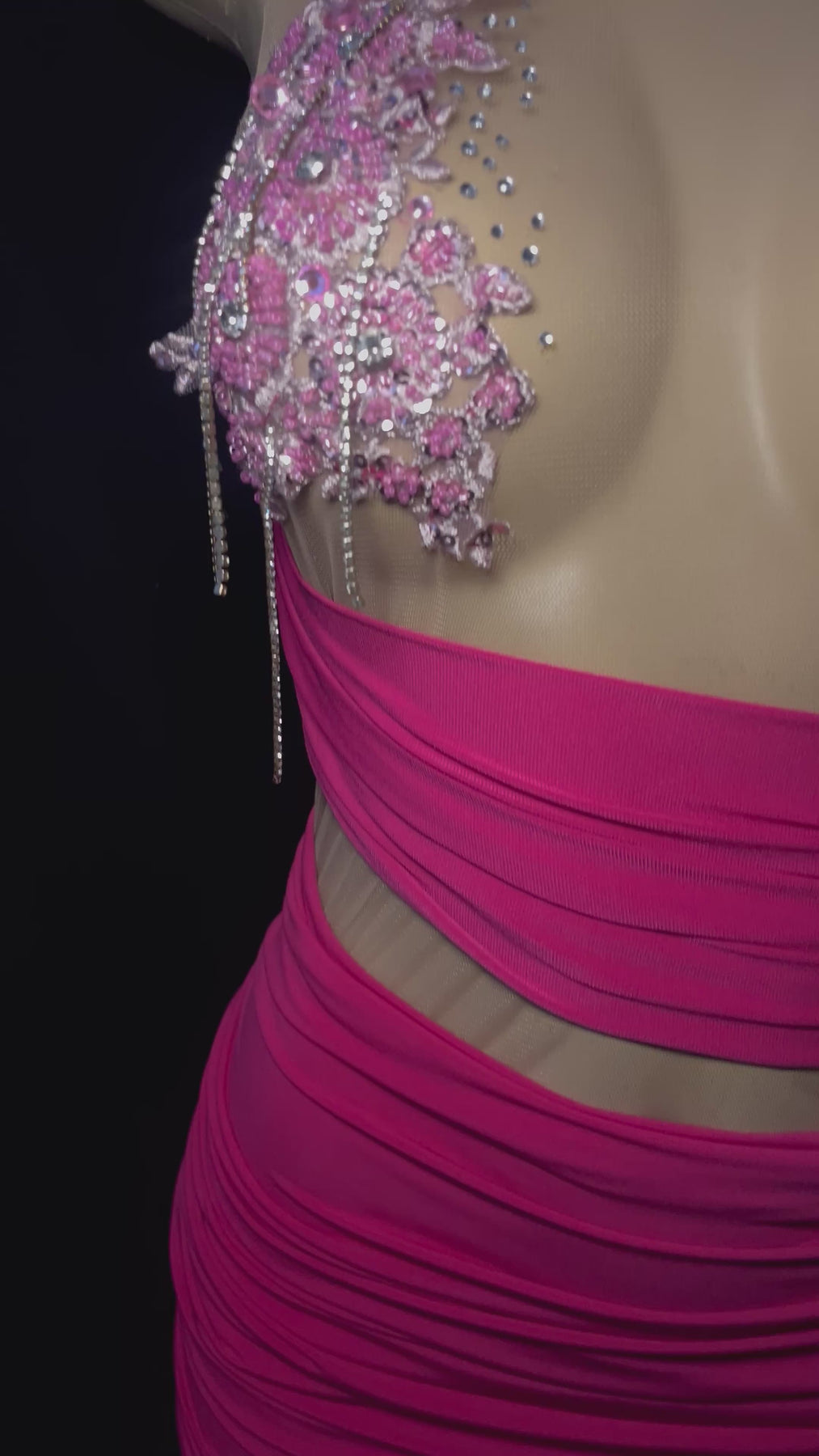 Be the hottest in the room with Zaria, the hot pink cut out dress adorned with sparkling crystal appliqués. Perfect for the confident individual who wants to stand out from the crowd. (Warning: wearing this dress may cause excessive attention and compliments!)